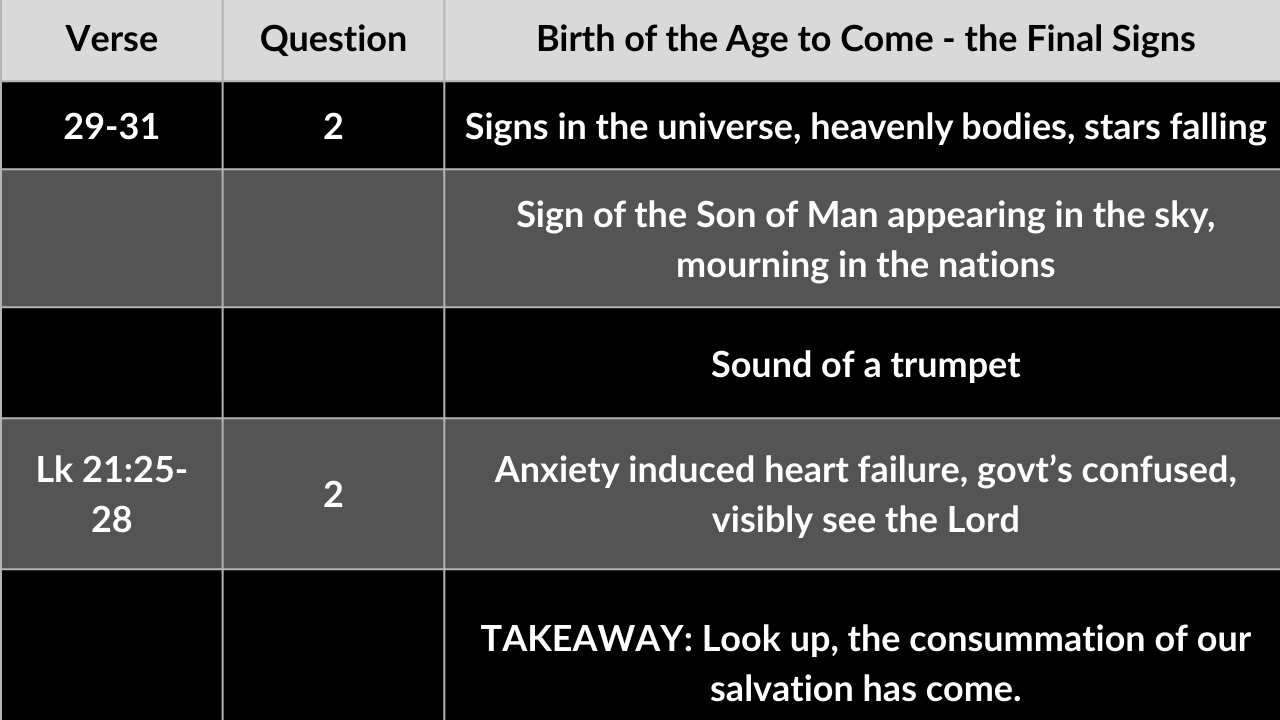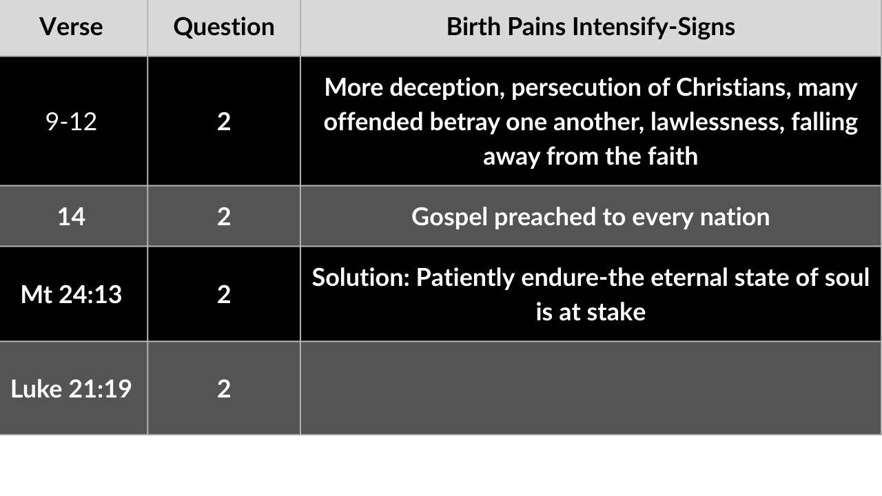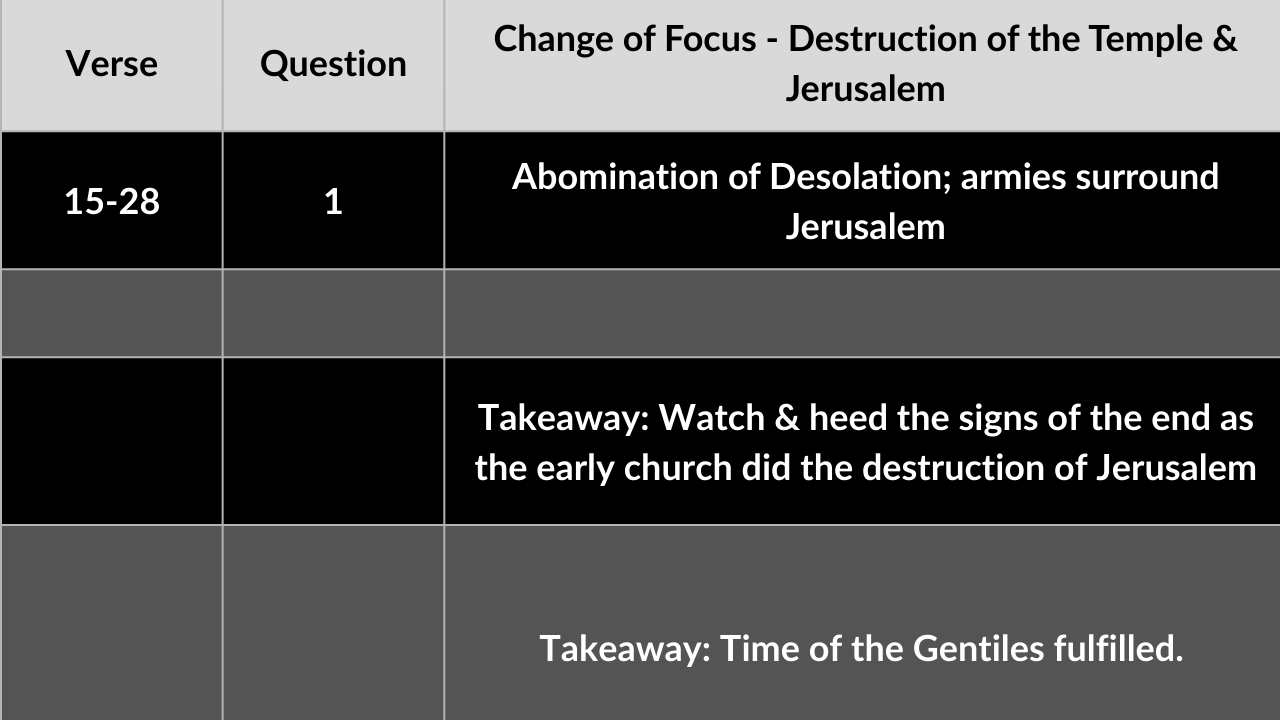 1. This passage requires an extensive study in order to fully understand it. For our purposes today, we just need to understand that Jesus was answering the disciples first question when they asked for the signs of the destruction of the Temple.